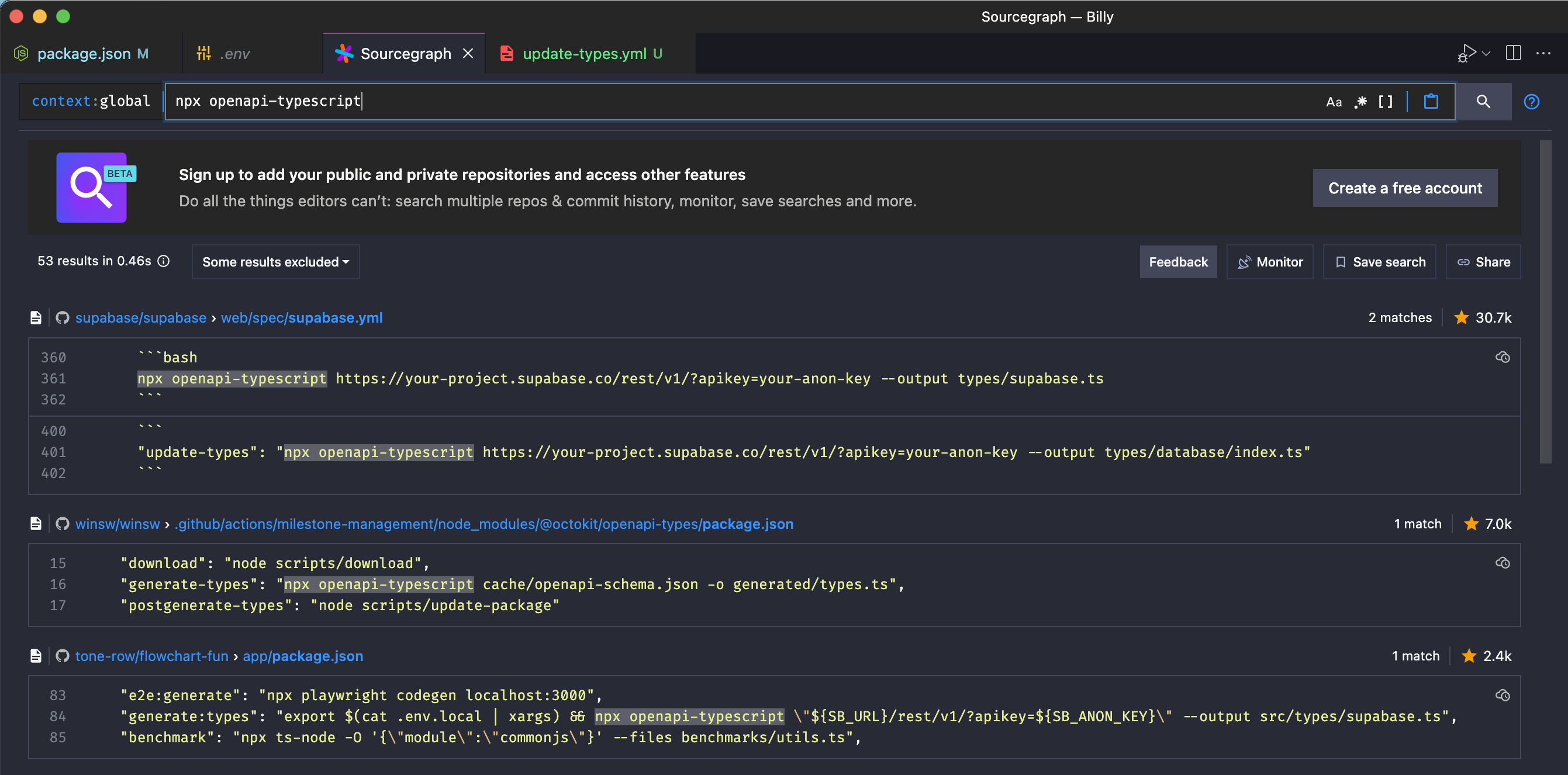 Once you have it installed, you can find the Sourcegraph icon at the side bar. When you click it, you will see the usual UI to do a universal code search. To find other projects that also generate types, we can pass in a query npx openapi-typescript.