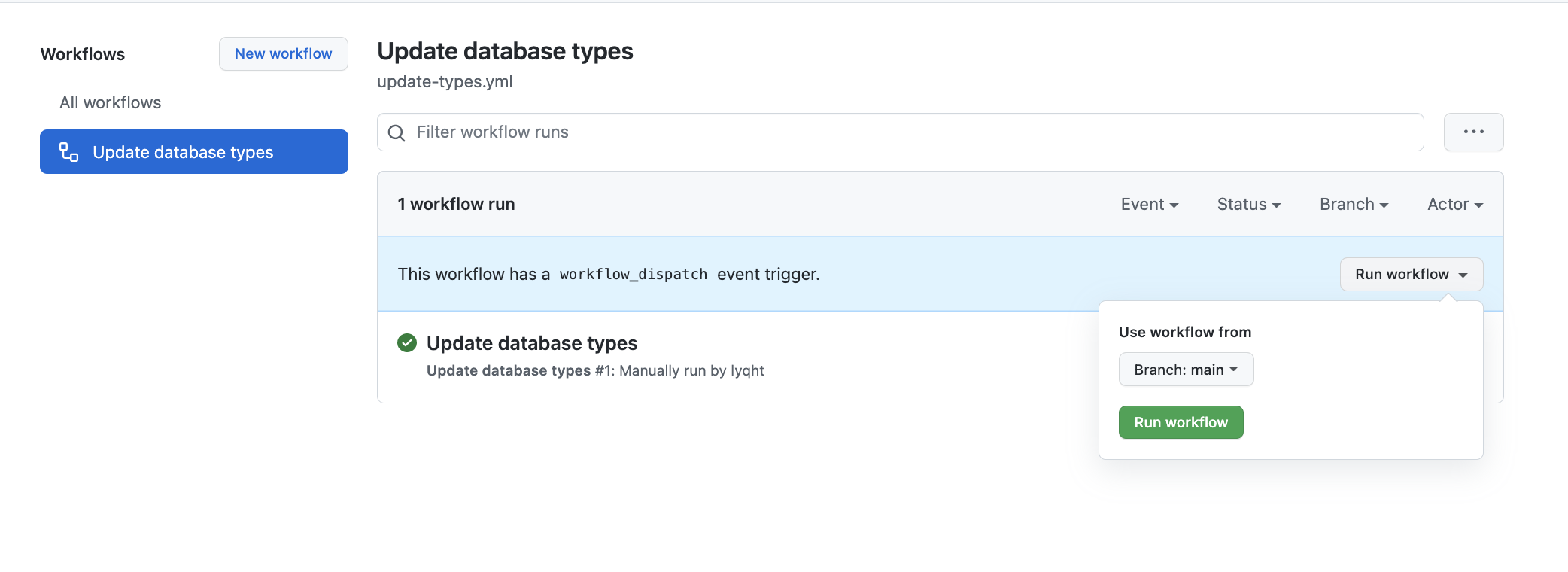 Then you will see the new workflow available in the Actions tab of your GitHub project. When you click on the additional options button, you can manually dispatch the workflow.